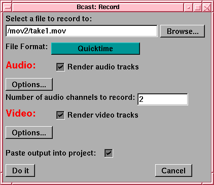 The Audio and Video areas define properties specific to the audio and video data. Within each file format, a number of compression parameters can be set for the audio and video. These compression parameters are set using the Options buttons for each data type. When you want to increase or decrease the amount of compression you should think Options.